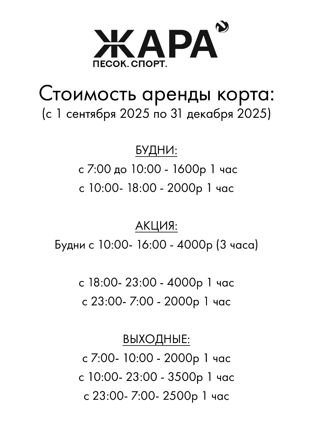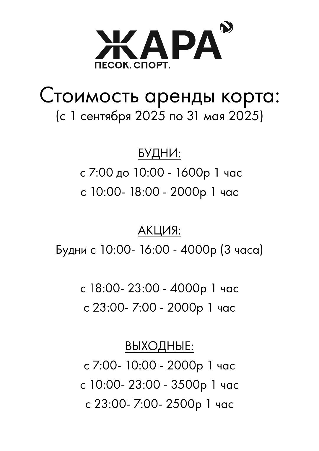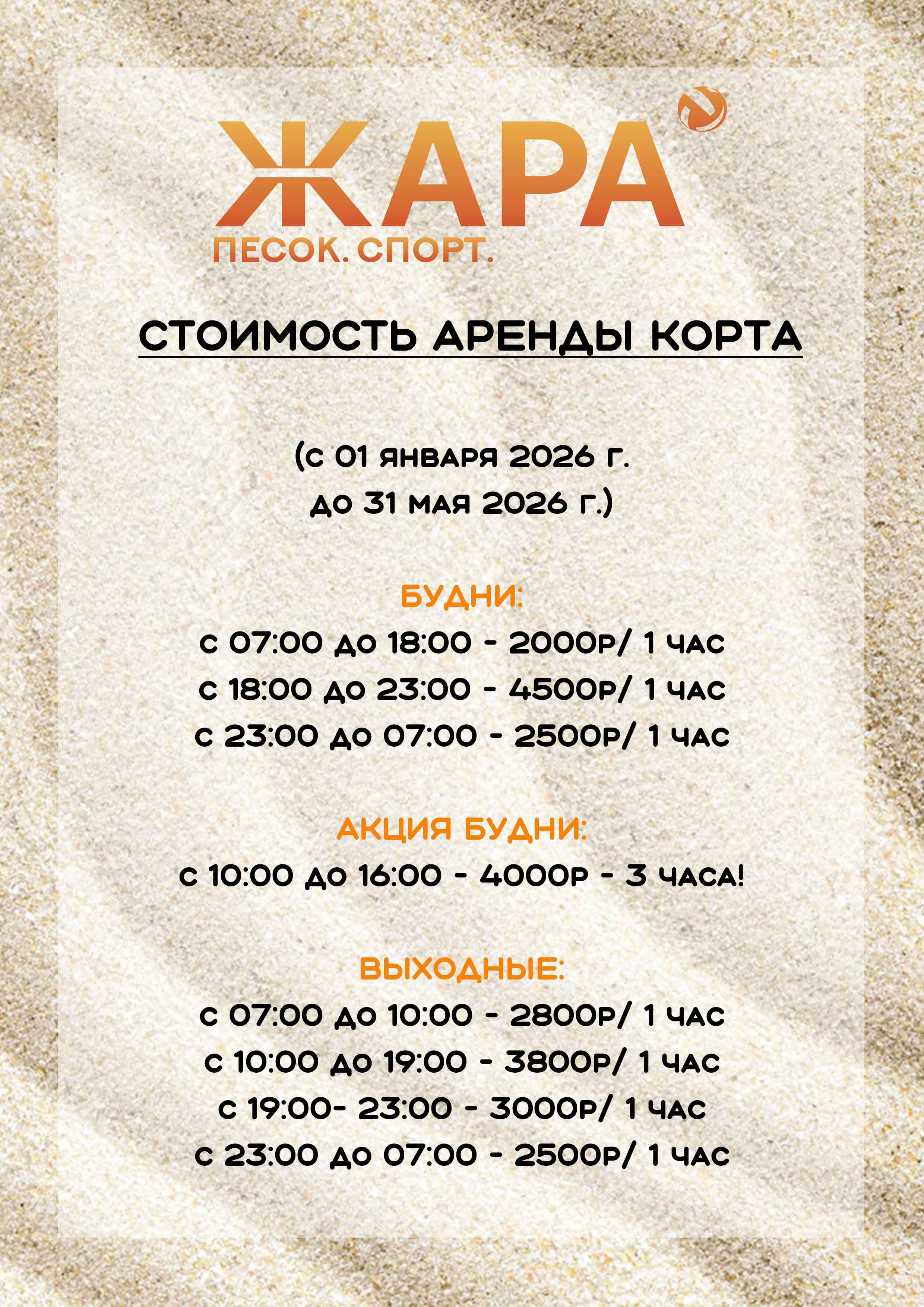 от м. Молодежная и станции МЖД Сетунь, ЦПВС "Жара" предлагает 3 крытые площадки для круглогодичных занятий пляжным волейболом и 3 открытых корта (парковка, раздевалка, душ, свет)